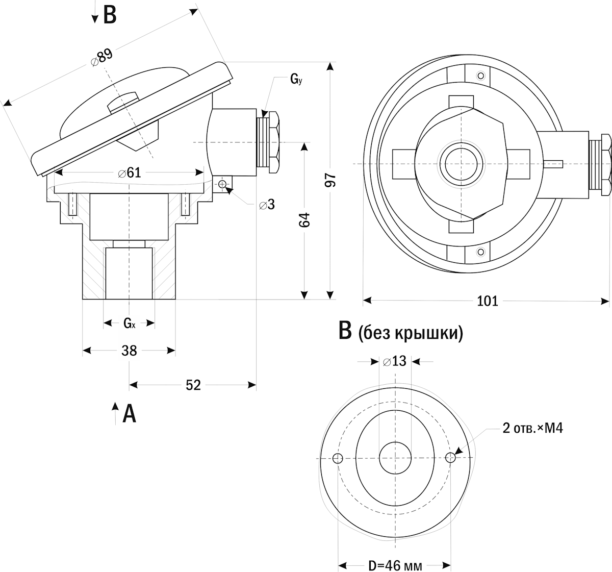 В коммутационную головку с помощью винтов М4 (не входят в комплект) монтируется клеммная колодка, к которой с одной стороны присоединяются контакты датчика температуры, с другой — контакты кабеля. Вывод датчика и присоединение защитной арматуры для него производится через отверстие с резьбой Gx (см. фото и чертеж). Кабельный ввод — отверстие с резьбой Gy (см. фото и чертеж).