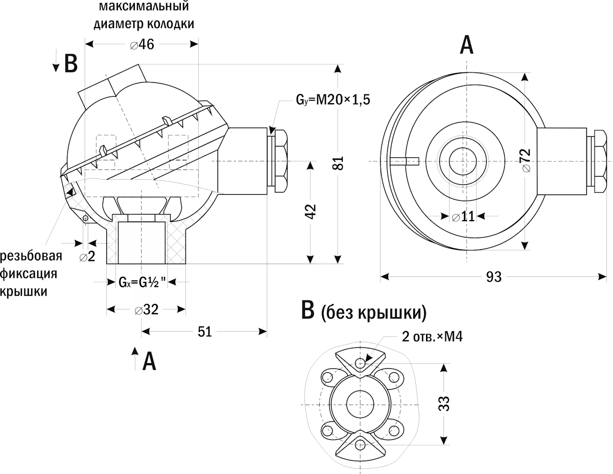 Монтаж: В коммутационную головку с помощью винтов М4 (не входят в комплект) монтируется клеммная колодка, к которой с одной стороны присоединяются контакты датчика температуры, с другой — контакты кабеля. Вывод датчика и присоединение защитной арматуры для него производится через отверстие с резьбой Gx (см. чертеж). Кабельный ввод — отверстие с резьбой Gy (см. чертеж).