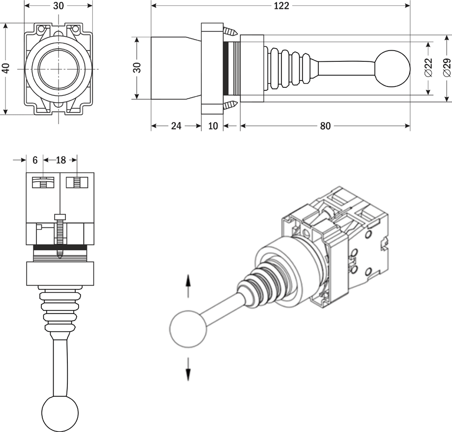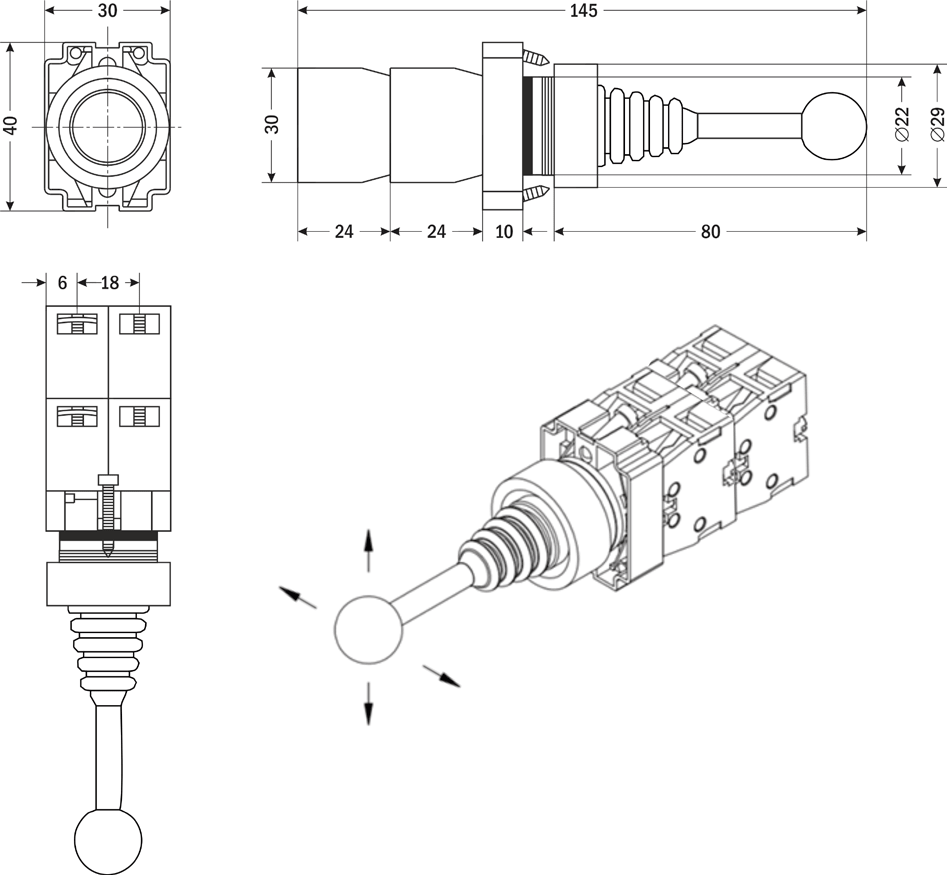 Физически контактная группа джойстиков состоит из контактов НО и НЗ, но функционально они работают как НО-контакты (кроме модификации *AR-XB2-PA22-M220), т.е. замыкаются при перемещении рукоятки в соответствующее положение. В нейтральном положении рукоятки все контакты разомкнуты